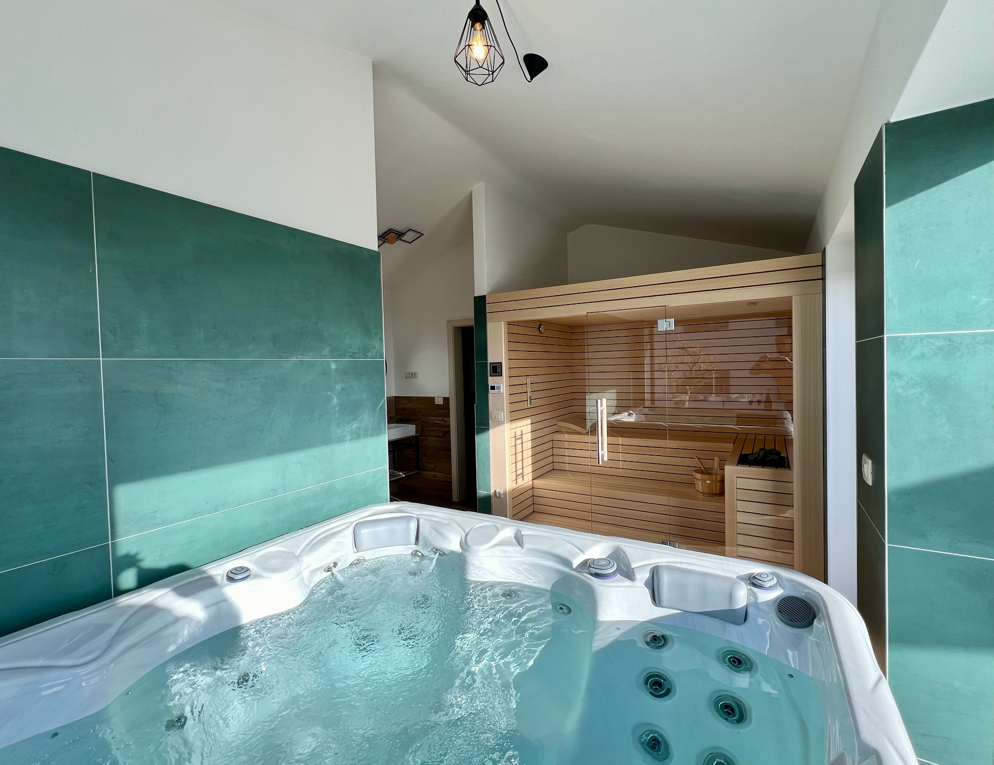Sauna, Whirlpool, Dusche und WC ergänzen den Außenbereich für ein ganzjähriges Urlaubserlebnis.