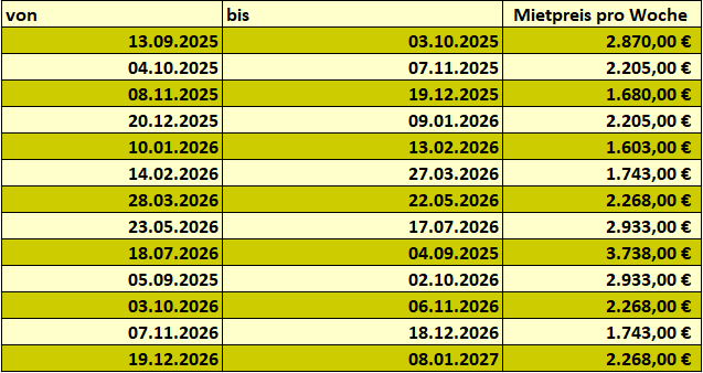 In der Nebensaison ist die Mindestmietdauer 4 Tage und in der Hauptsaison (12.7.-12.9.2025) 7 Tage.